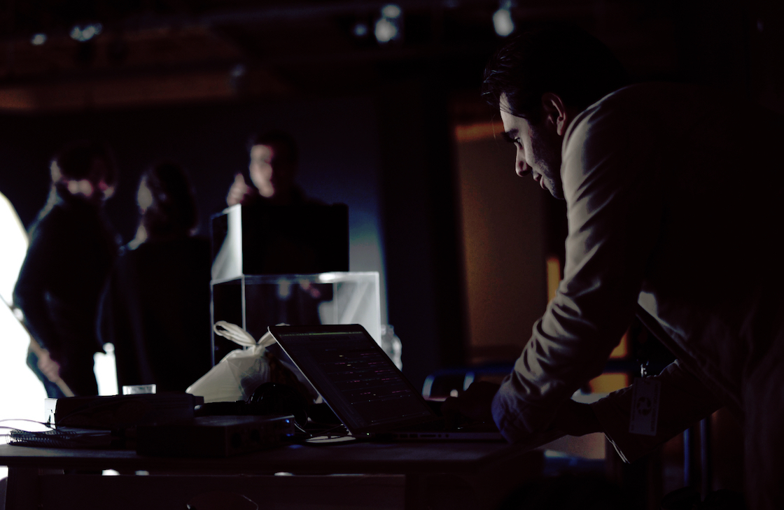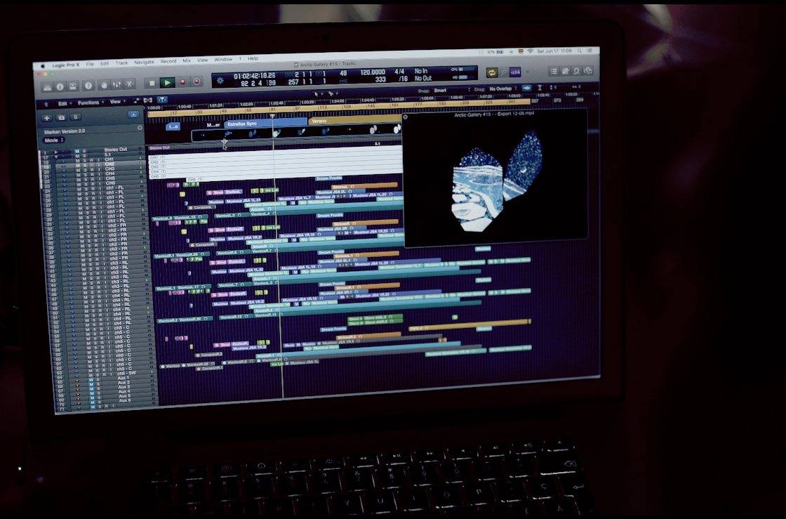 This project hinged not only on musical composition, but on sound design. Javier Asencio used the sound of ice cracking from the North Pole, recorded by the National Film Board, processing them to create harmonic textures that were integrated into the score. Because the physical experience and sound spatialization were key, he chose to use a non-standard 9.1 system to deliver a fully immersive experience—creating, as artistic director Étienne Paquette noted, “a window by which you see another Arctic, beyond the ice.”